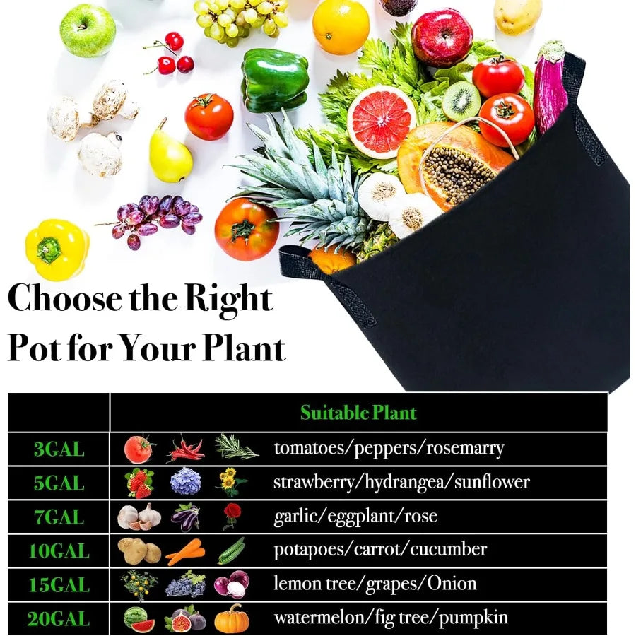 - Size versatility: choose from 3, 5, 7, and 10 gallon bags to tailor each planter to your garden layout and crop needs.
