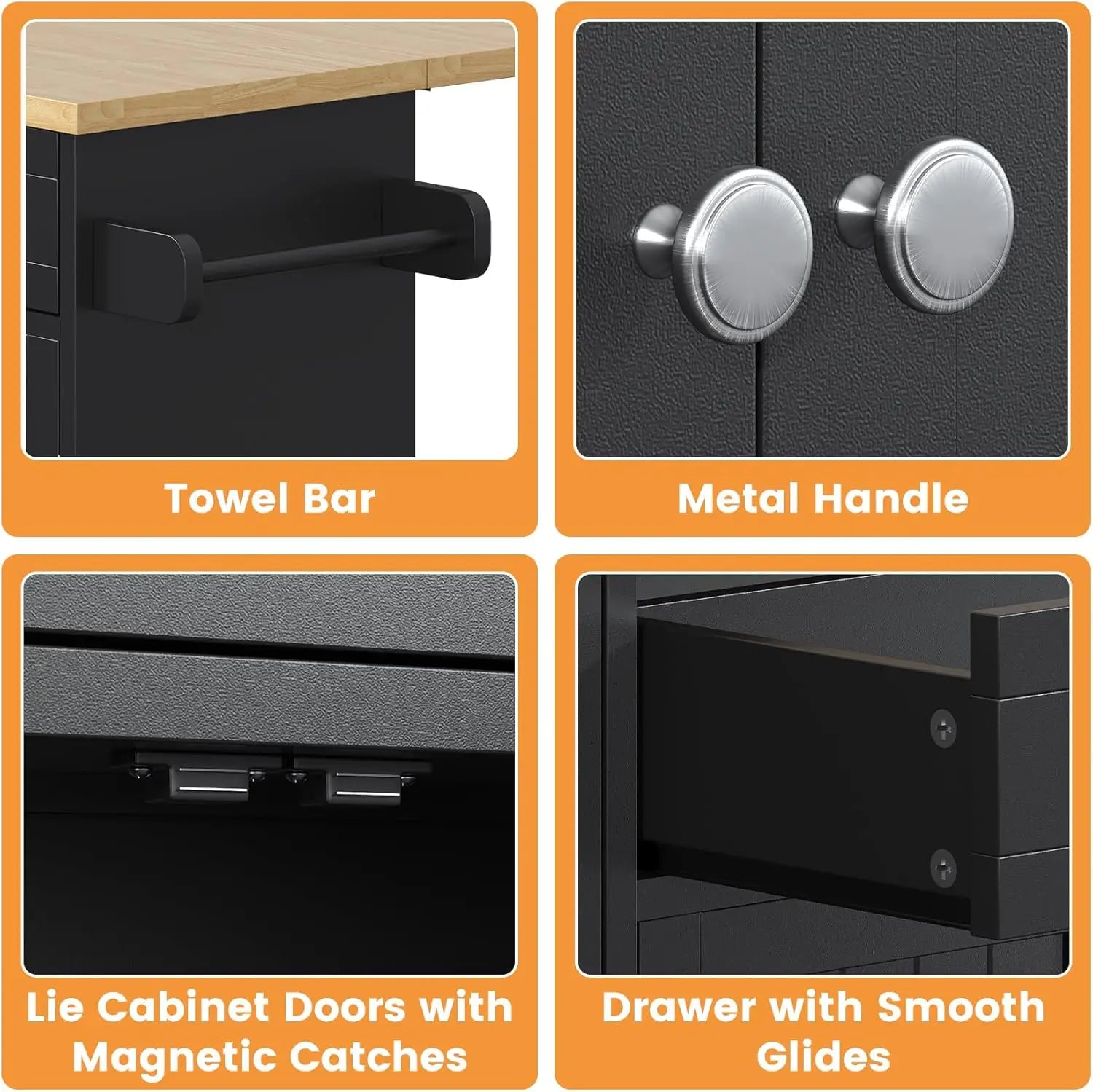 - Keep pots, pans, and kitchen essentials organized in the storage cabinet with doors, right where you need them, improving flow.
